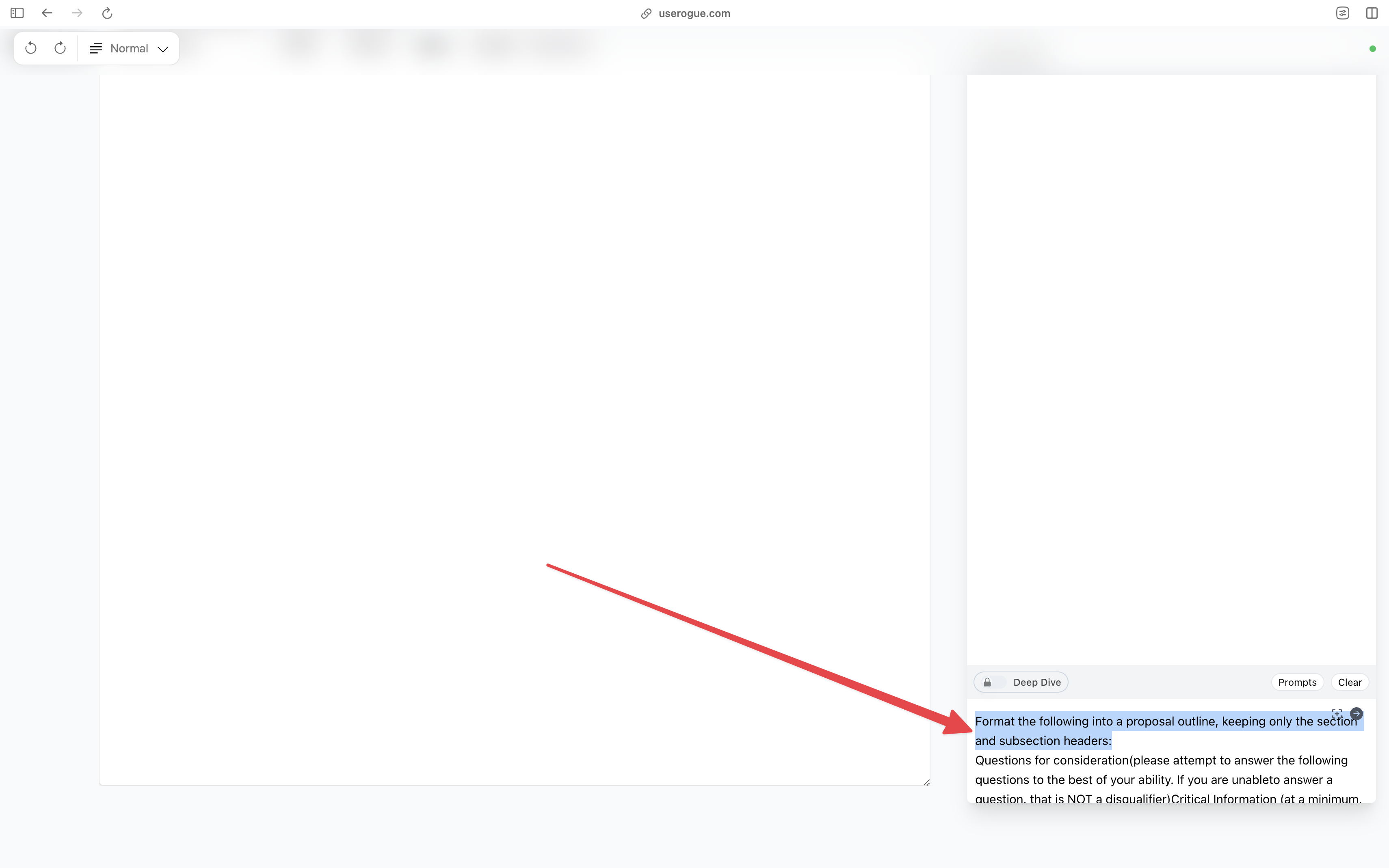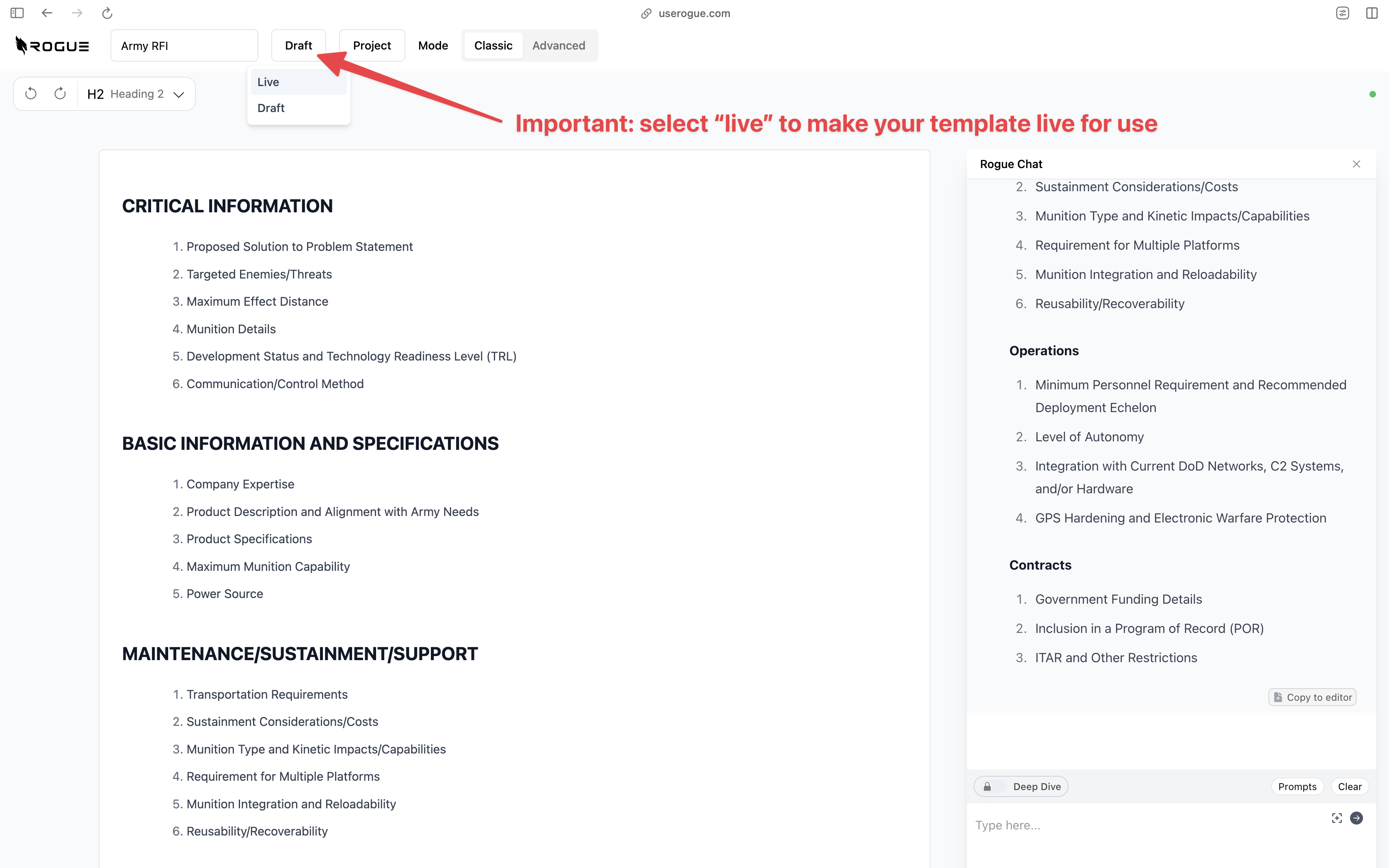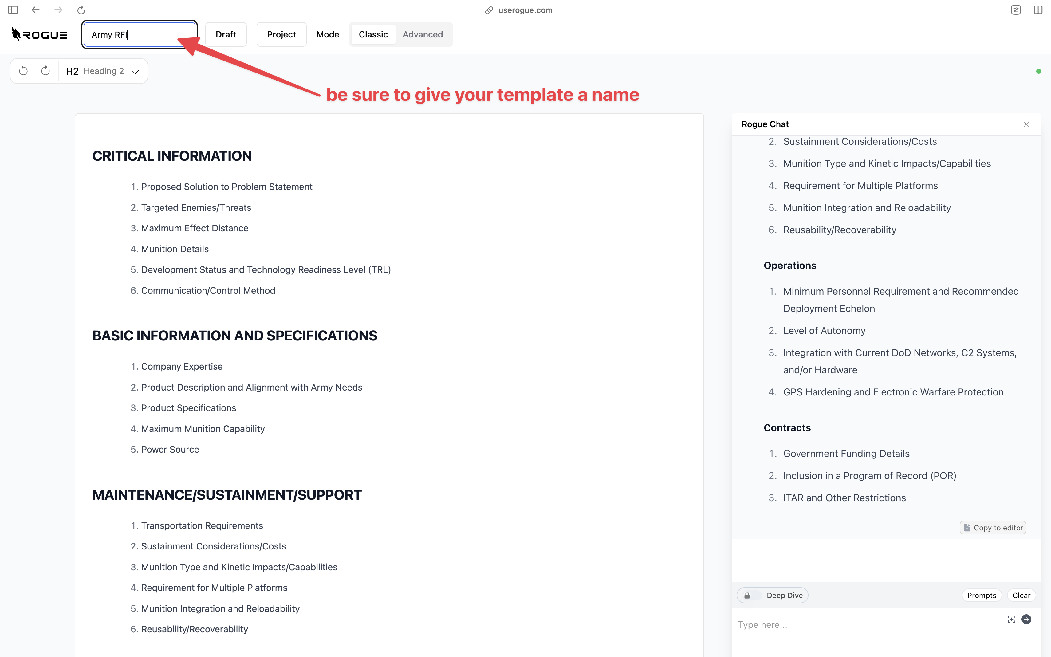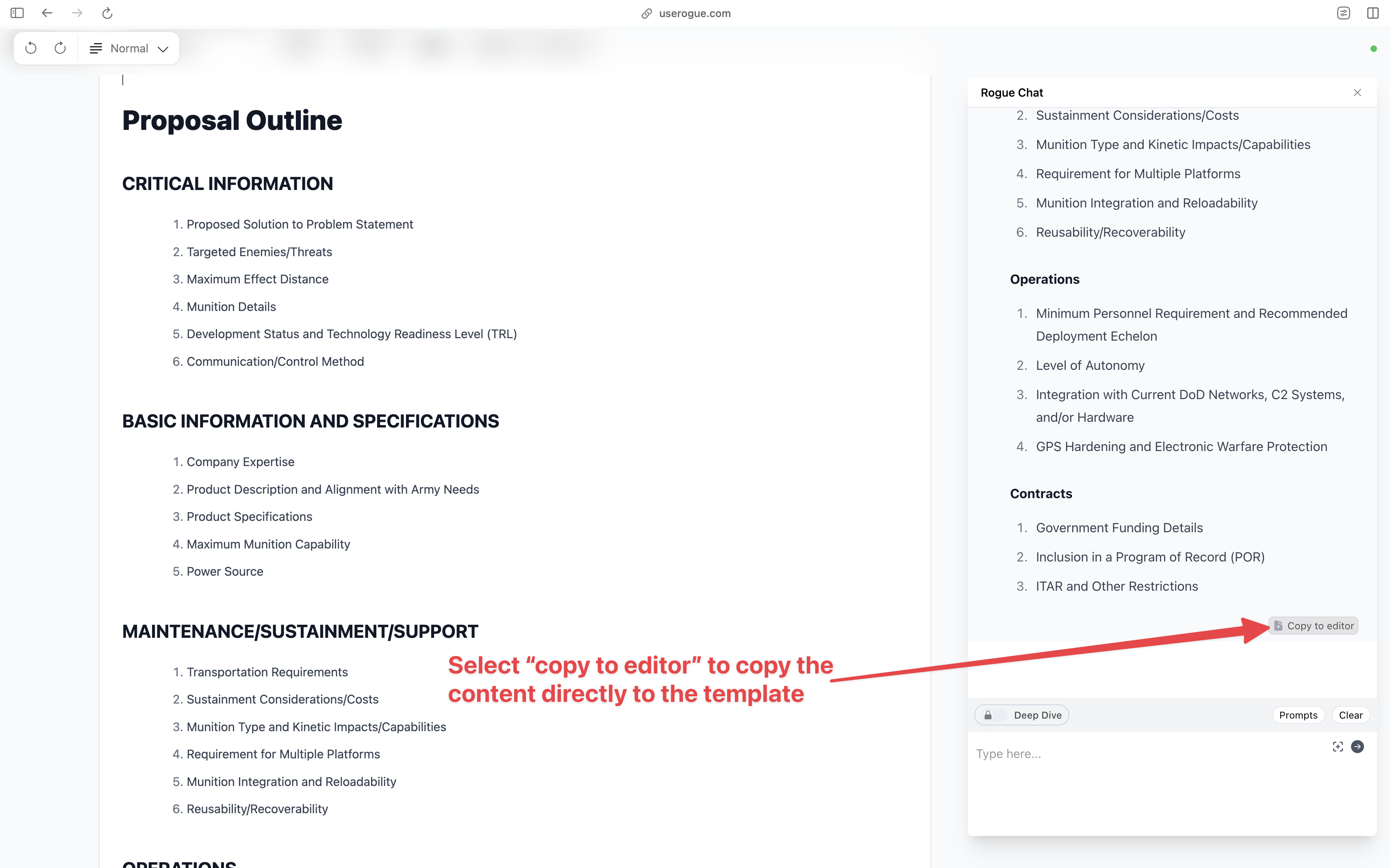 You can also use the chat window to help you create your template. Simply copy the proposal format instructions from the RFI/RFP/RFQ and paste them into the chat window with a simple instruction like “Please create a template from this document”.