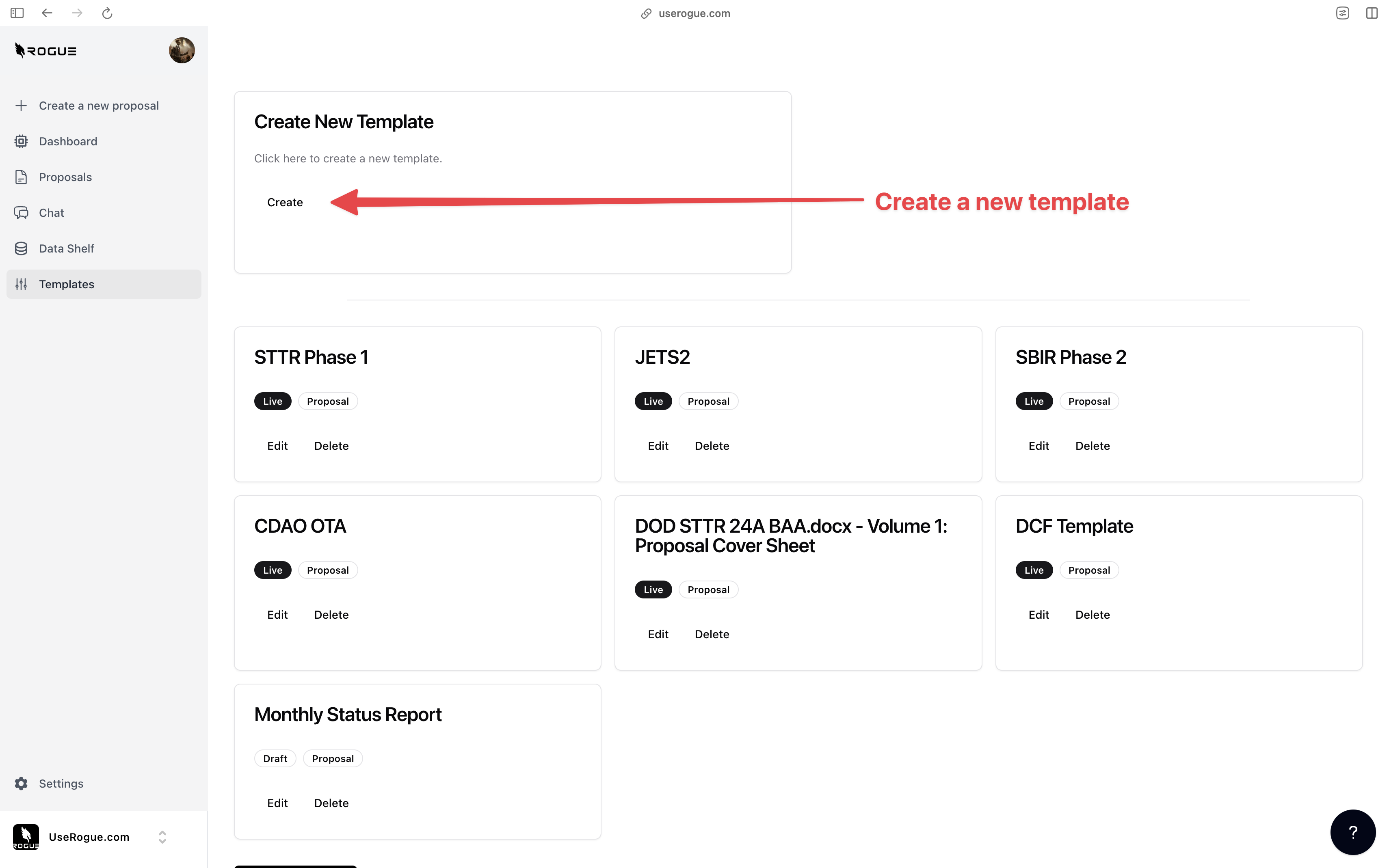 Templates are most useful for solicitations and document types that have common formats for instance, many MAC/IDIQ contracts, broad agency, announcements, RFI’s, Source Sought, and other open calls tend to maintain standard formats. With these types of solicitations, it is less efficient to go through the RFP upload function because the document templates will always be the same, so we enable you to shortcut this process, by simply establishing a document template. You can create a template from scratch by selecting “Create New Template”.Creating a template