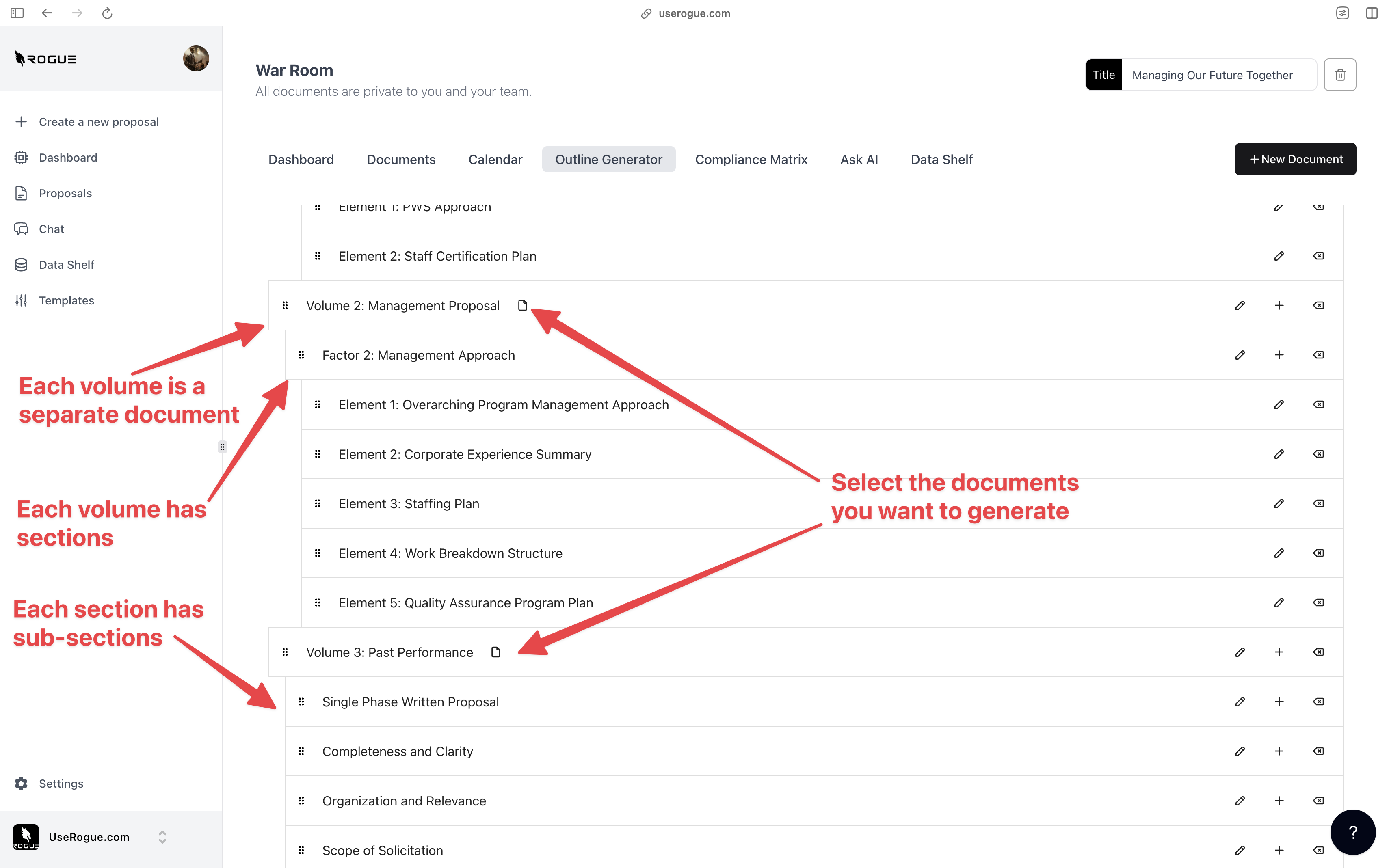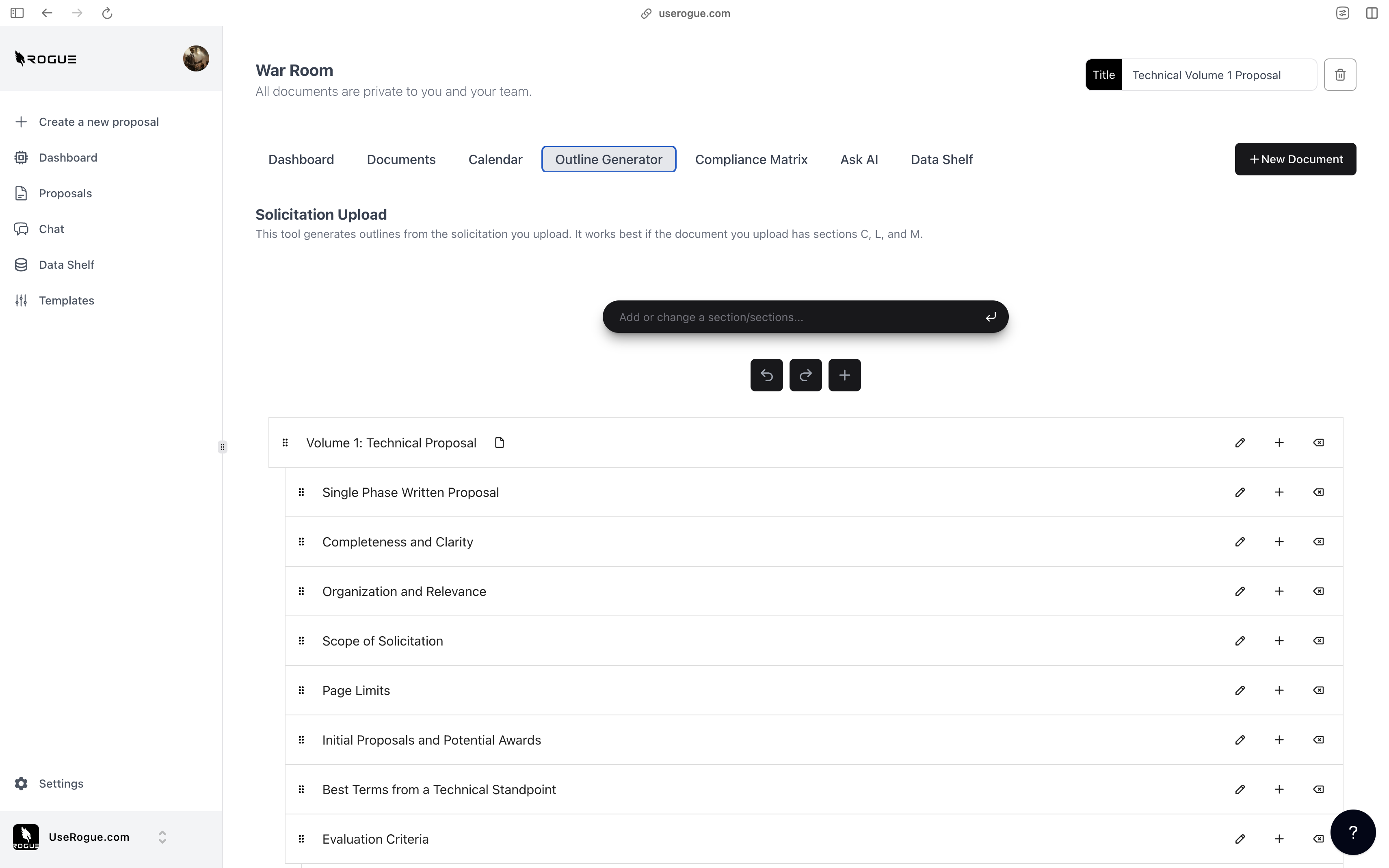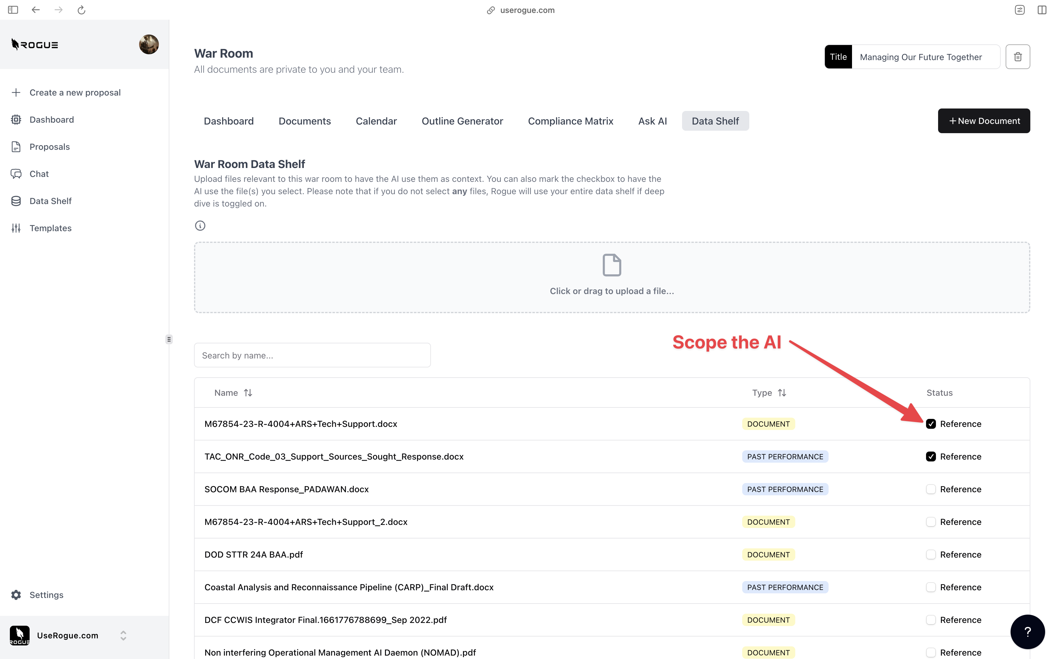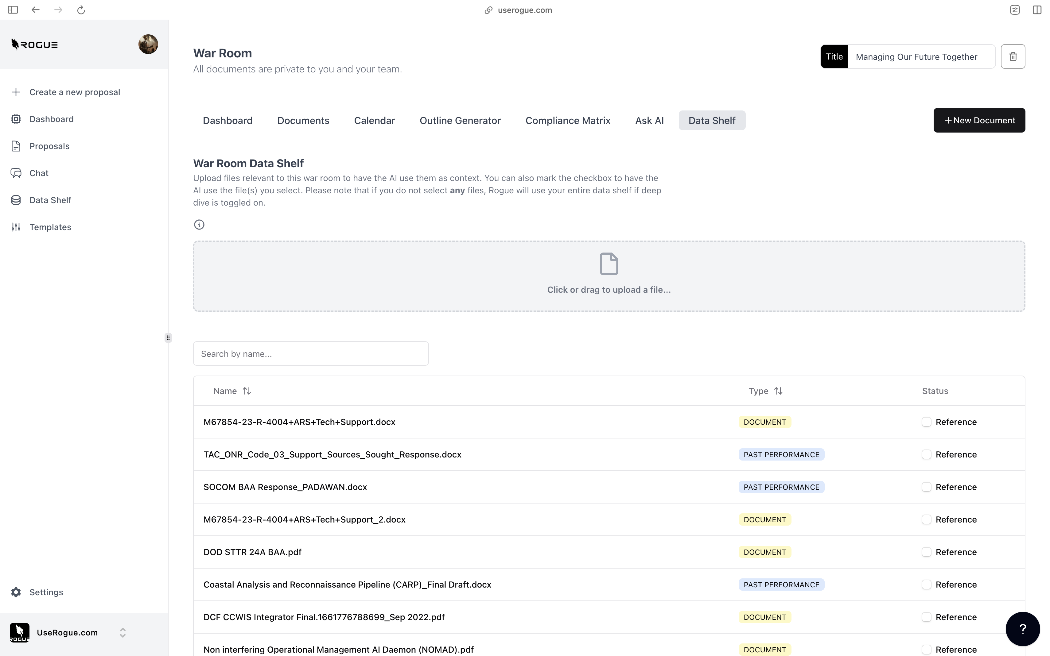 Rogue has two levels of data shelf: the organization-level and the War Room Level. The organization-level data shelf is designed to be a repository for all of the documents that are relevant to the overall organization’s proposal efforts. These are foundational documents that the AI should index and use to generate content for ALL proposals. The War Room level data shelf sit on top of the org-level data shelf and is designed to be a repository for additional documents that are only relevant to the specific proposal effort.