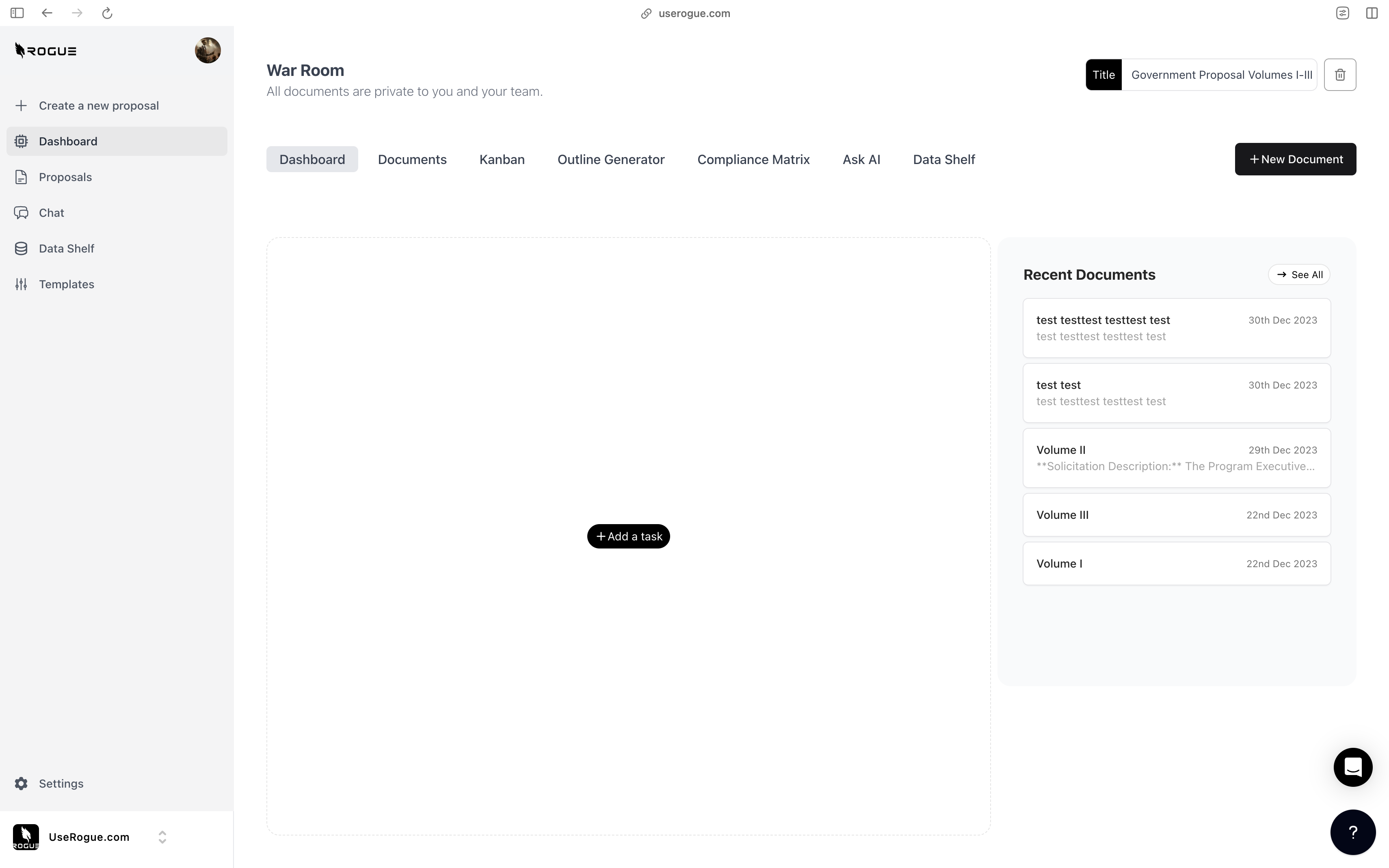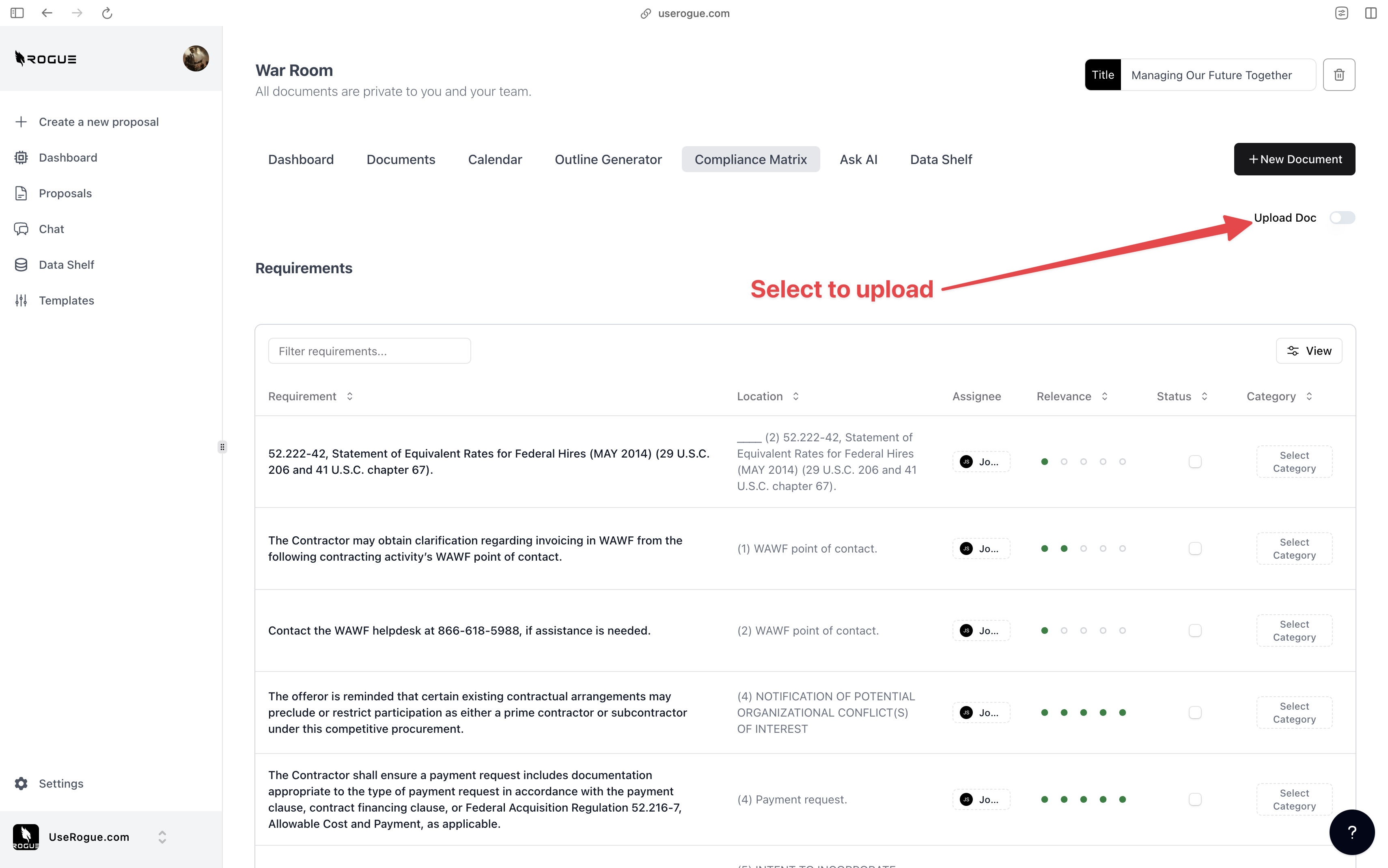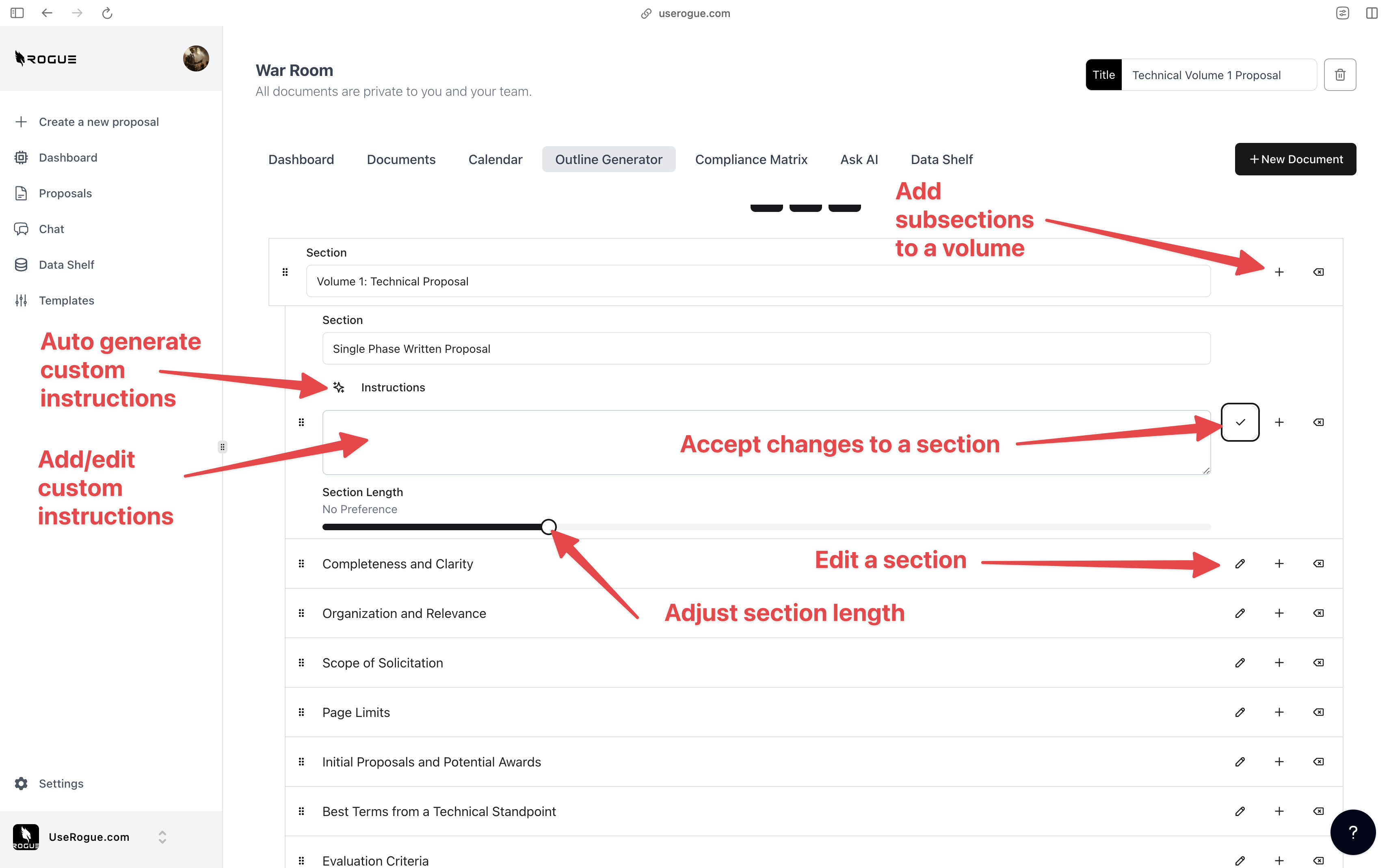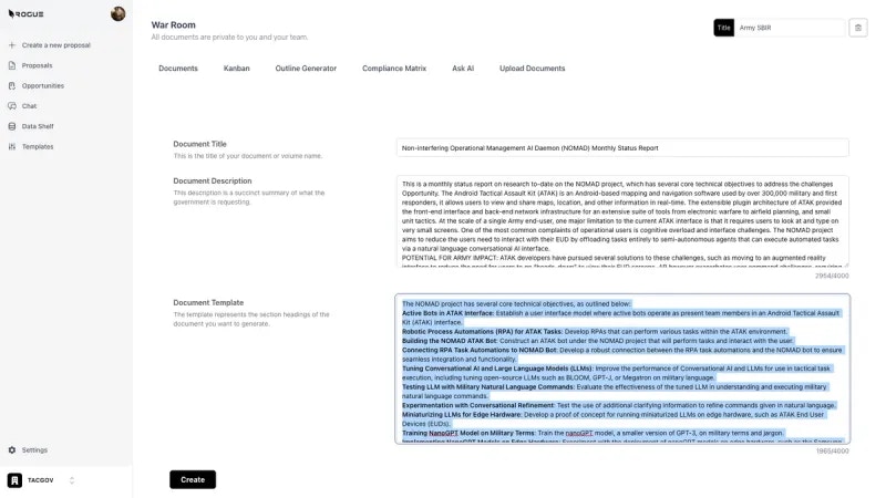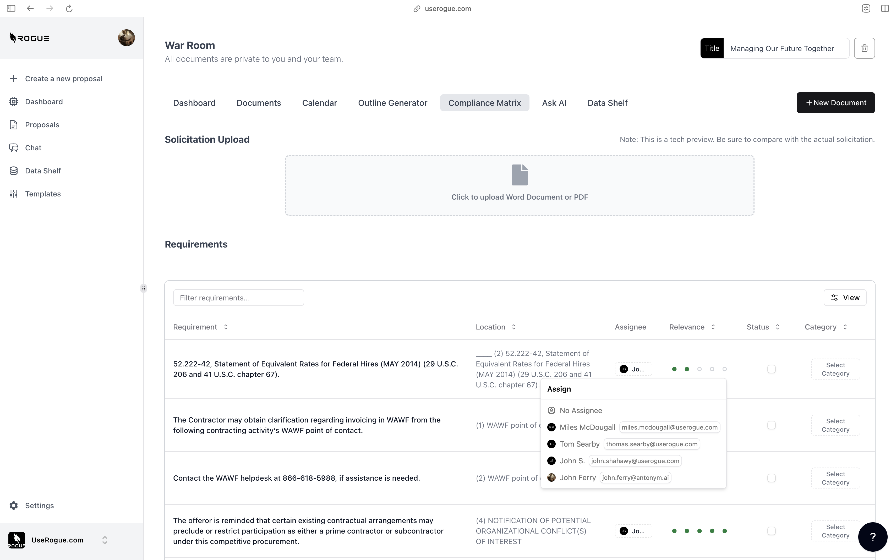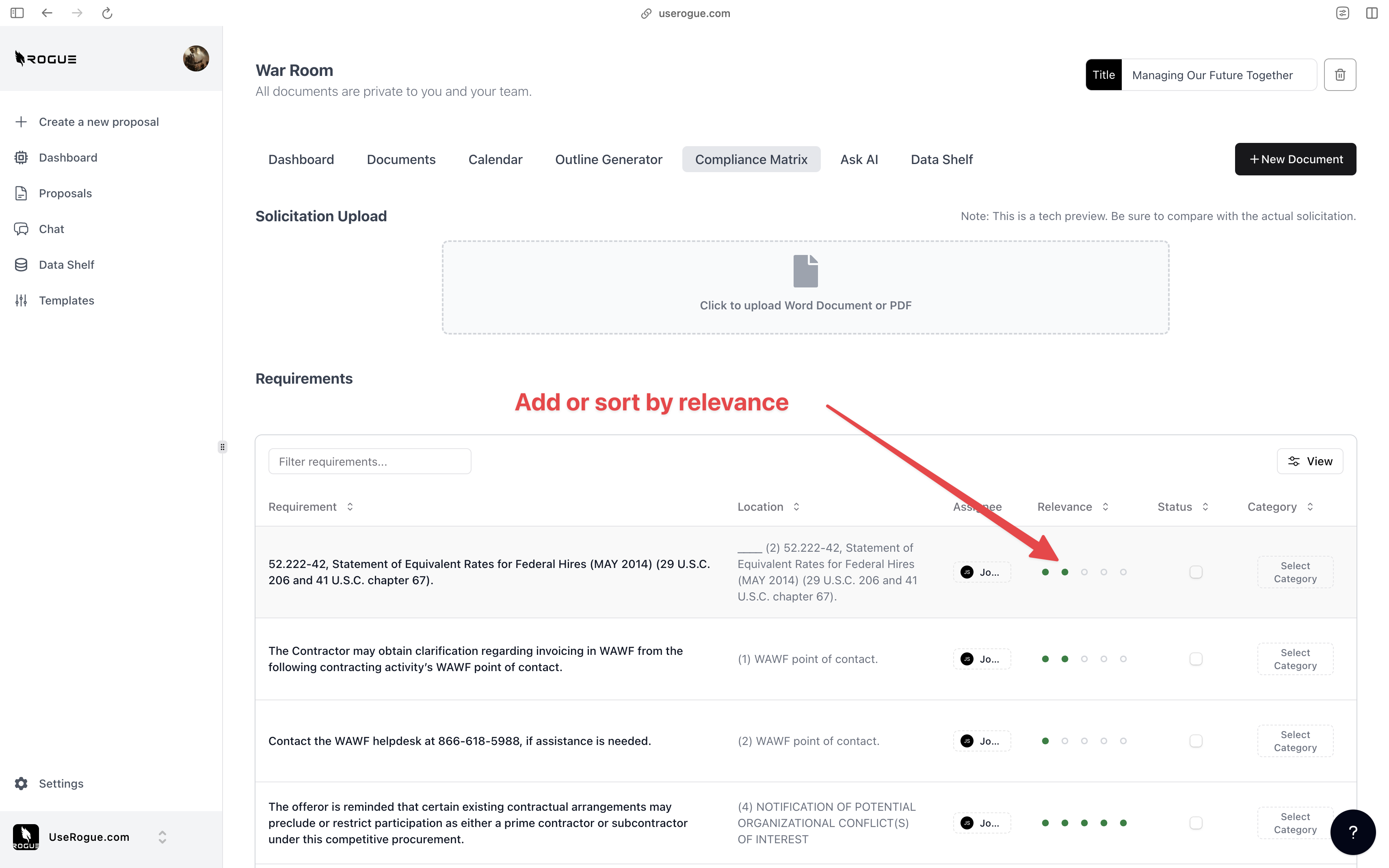 Rogue has two levels of data shelf: the organization-level and the War Room Level. The organization-level data shelf is designed to be a repository for all of the documents that are relevant to the overall organization’s proposal efforts. These are foundational documents that the AI should index and use to generate content for ALL proposals. The War Room level data shelf sit on top of the org-level data shelf and is designed to be a repository for additional documents that are only relevant to the specific proposal effort.