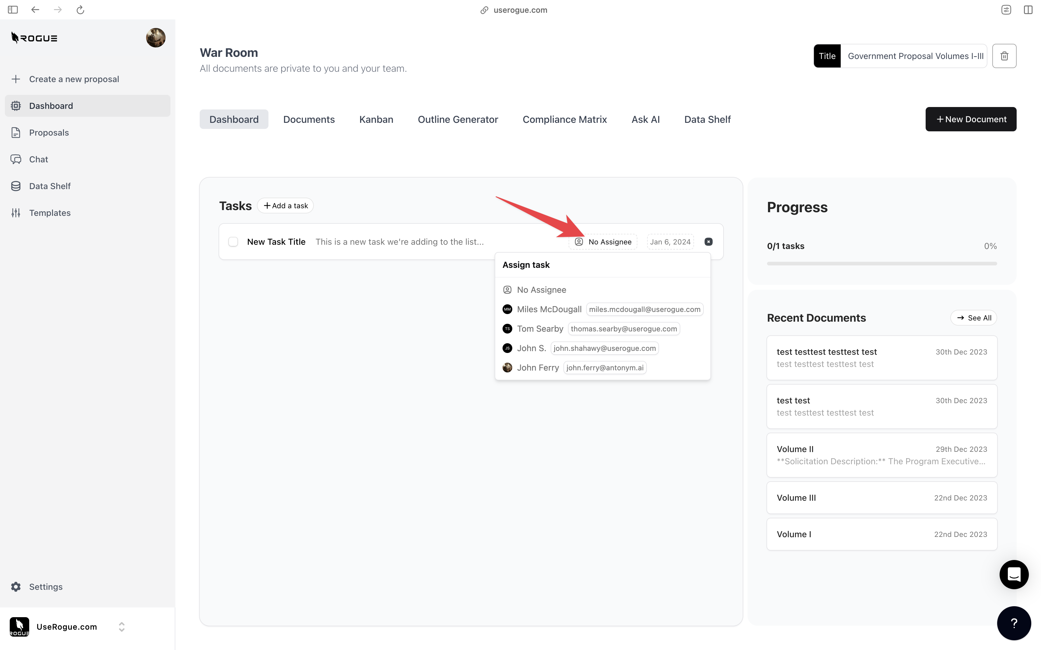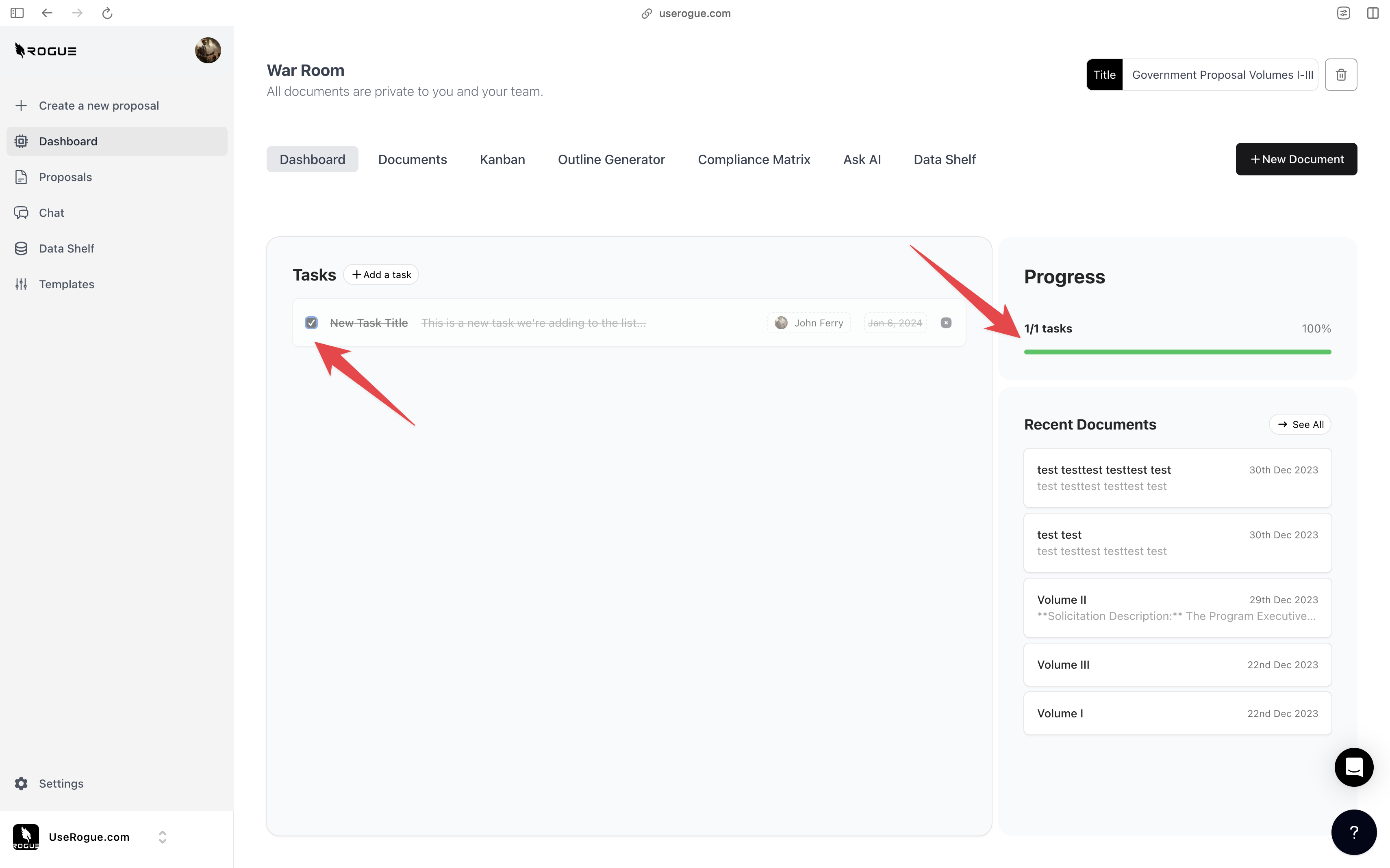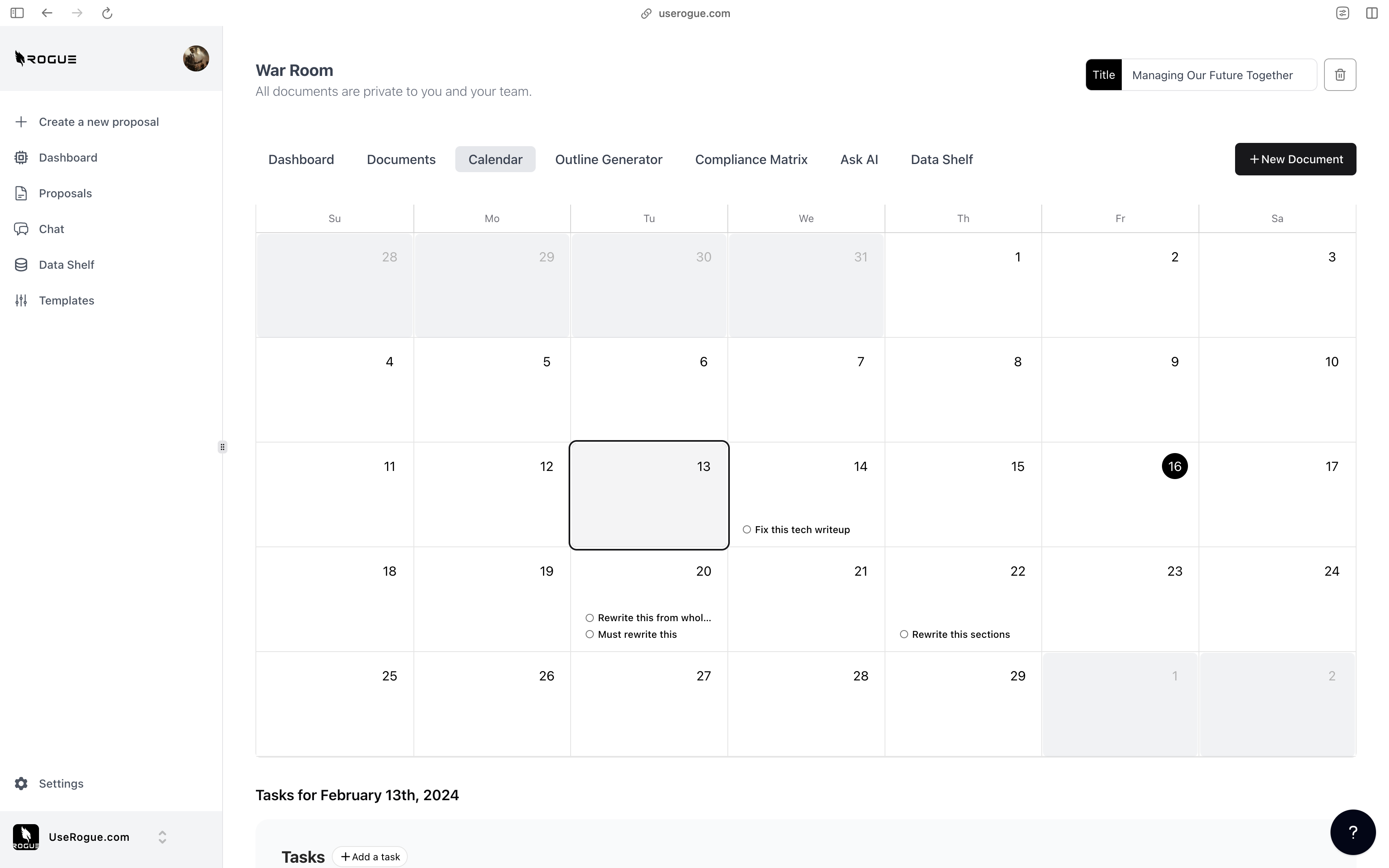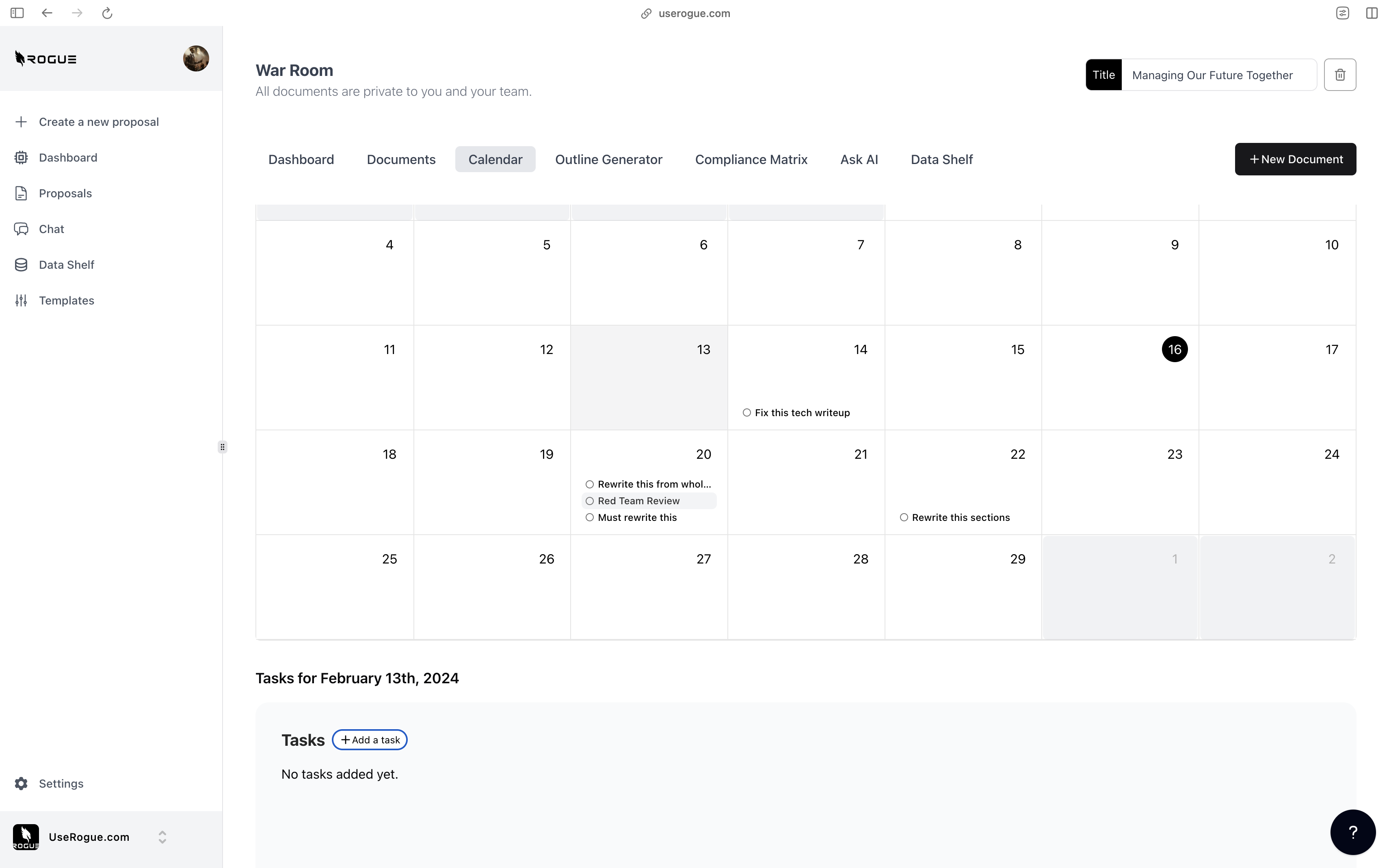 Rogue has two levels of data shelf: the organization-level and the War Room Level. The organization-level data shelf is designed to be a repository for all of the documents that are relevant to the overall organization’s proposal efforts. These are foundational documents that the AI should index and use to generate content for ALL proposals. The War Room level data shelf sit on top of the org-level data shelf and is designed to be a repository for additional documents that are only relevant to the specific proposal effort.