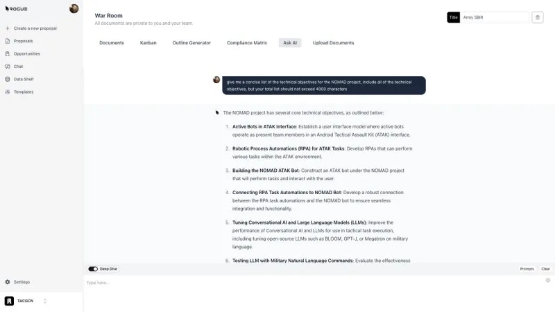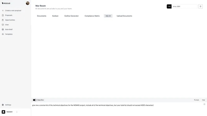 AskAI enables you to use the power of AI chat within the context of an individual War Room and proposal effort.