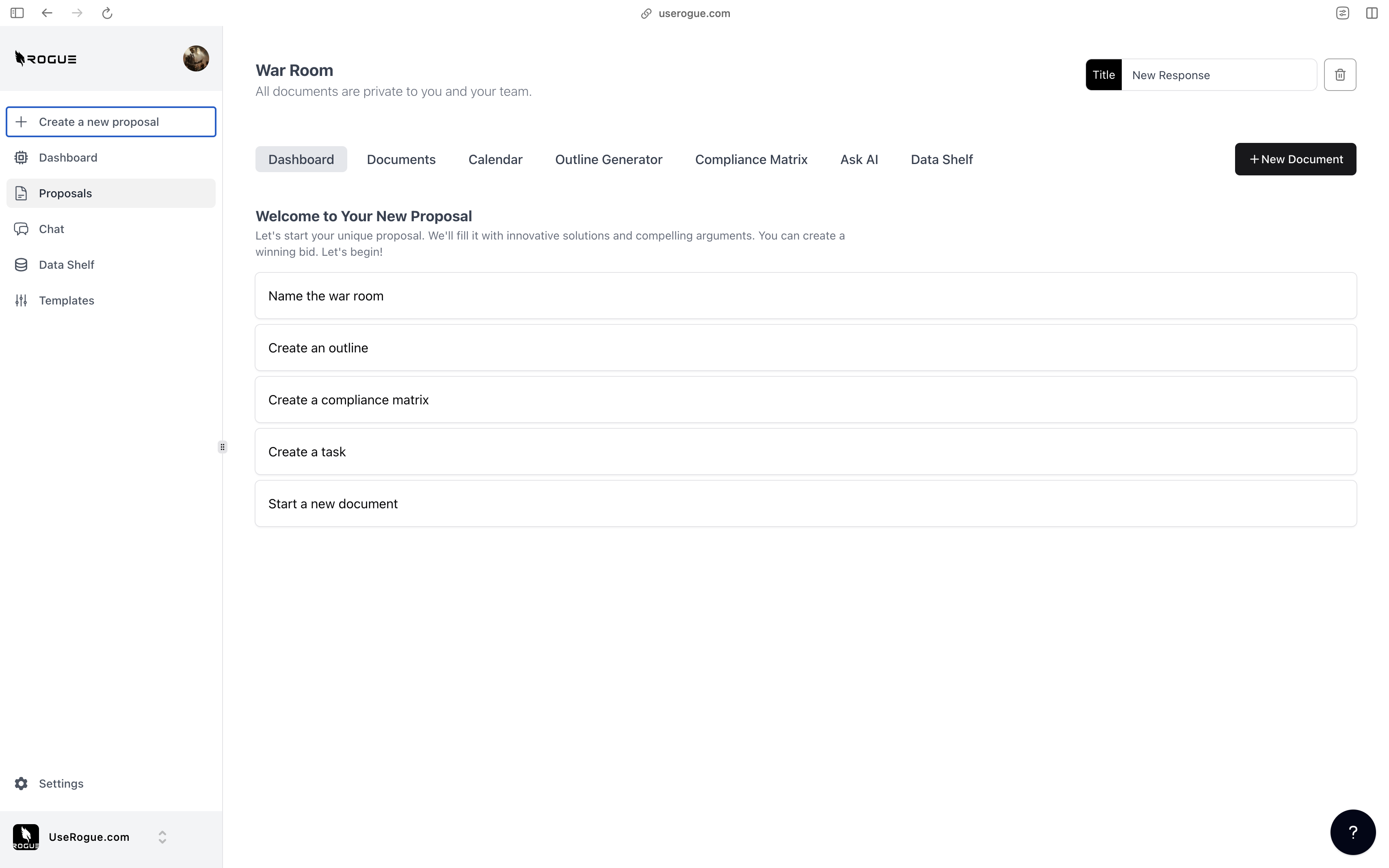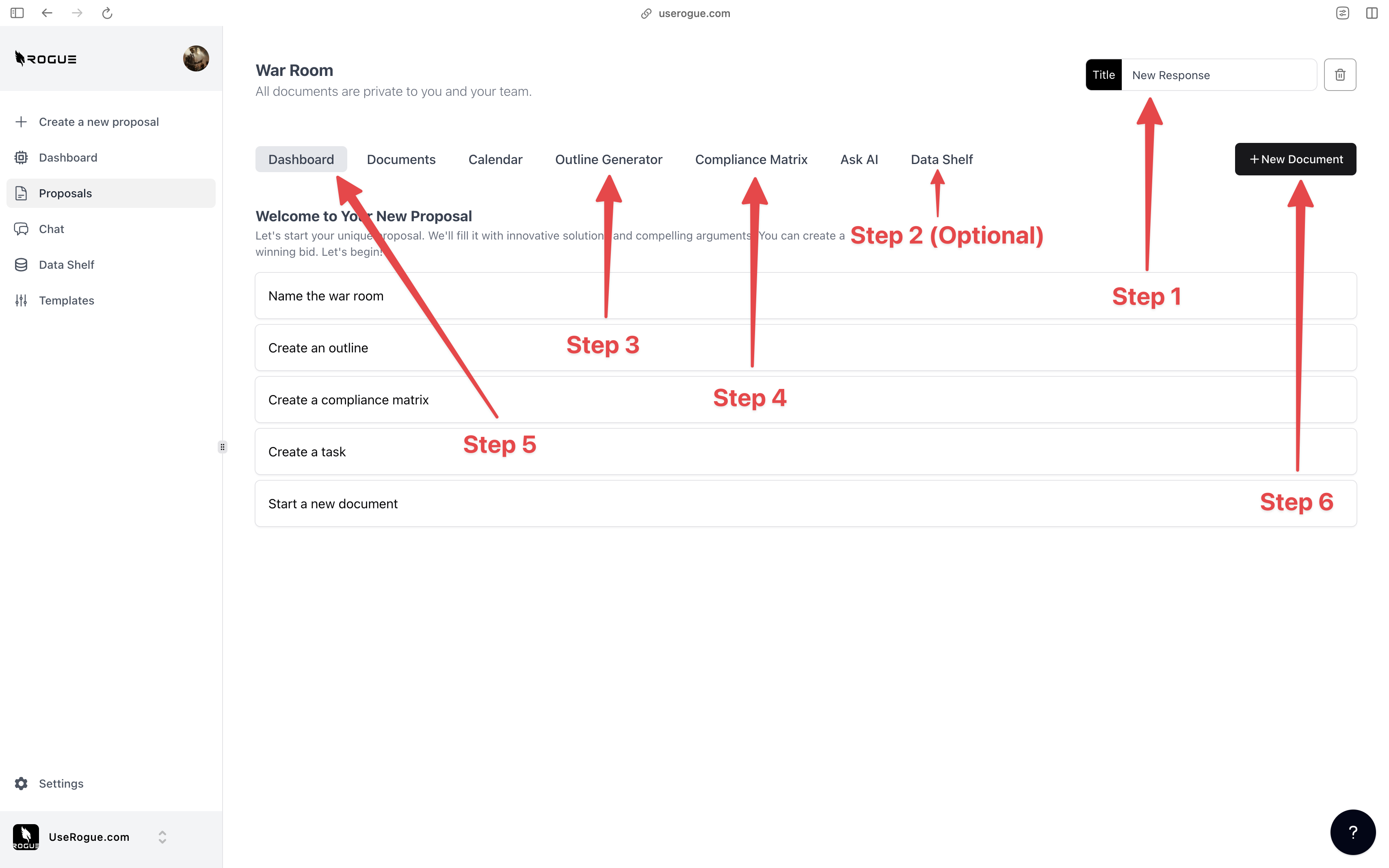 The war room dashboard is the starting point for all of your proposal efforts and lists the four key stpes to quickly starting a proposal: