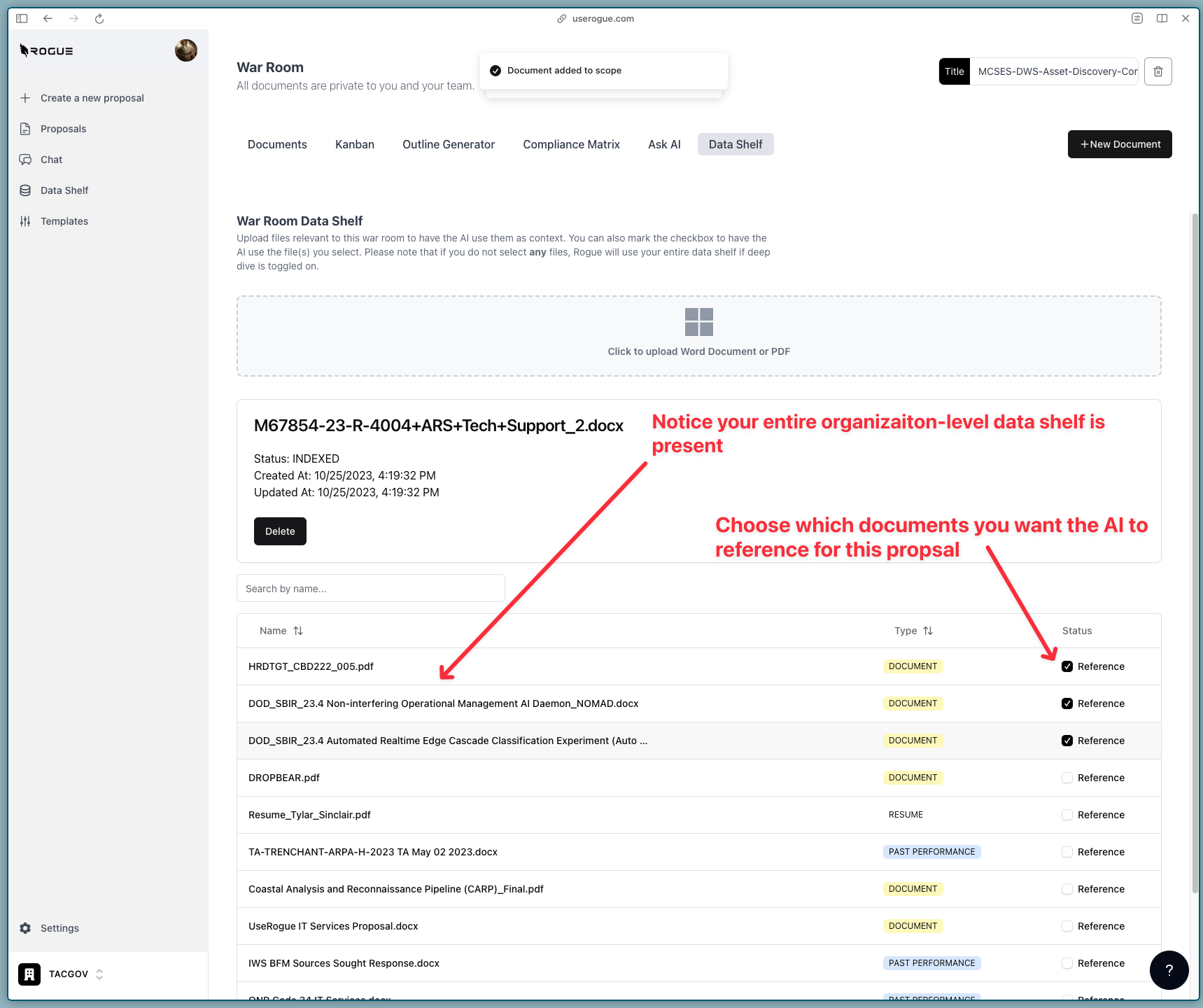 - Select documents for the AI to index from the organization-level data shelf and/or upload specific to this proposal.